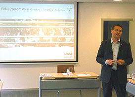 FISU Vice-President Stefan BerghSAIF President Ms. Johanna Saint Clair Renard thanked FISU representatives Laurent Briel, Milan Augustin and Kolë Gjeloshaj for welcoming the SAIF. The working session started with a presentation from the FISU representatives of the most updating strategic approaches in the development of FISU.