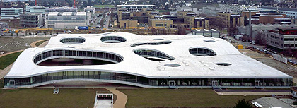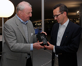 FISU President Killian presents a souvenir to the SUSF PresidentThe final day of the meeting ended with an invitational dinner in the Rolex Learning Center located at the EPFL, the Federal Polytechnic School of Lausanne. The dinner was hosted by the SUSF, the Swiss FISU Member Association. SUSF President Andreas Csonka together with Leonz Eder, SUSF Managing Director and FISU Assessor and Hans Bodmer, SUSF Foundation Vice-President and FISU Legal Committee member welcomed the FISU delegates. Present as well were a number of representatives of the Sports Department of the University of Lausanne.