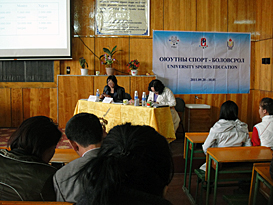 The main purpose of this campaign is to deliver activity of FISU a little by little and to recognize university sports as well as a procedure of NUSF Mongolia in all part ofMongolia. The working group consisted of 4 members headed by MSSF Secretary-General Dr. Jargalsaikhan D. They gave their interview and talked with many students, teachers and colleagues of the Teacher’s College of Mongolian State University of Education in Arkhangai province, the Economic Institute of National University of Mongoliain Zavkhan province, the Nursing College in Gobi-Altai province and Khovd University.