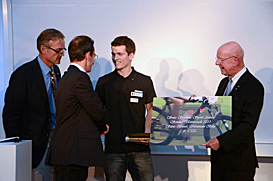 Silvio Büsser, winner of the 2nd Swiss Students Sports Award, Summer Universiade Shenzhen, with donator Arthur Eugster (right), SUSF President Andreas Csonka and Head of Elite Sport, Fredi Schneider (left)