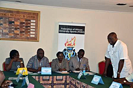 FASU 2nd Vice-President Prof. Nteere delivers a welcoming message to the Central Region leadershipAfter a one day meeting on February 9th which saw delegates from six (6) countries meet at the offices of the National University Sports Federation of Cameroon (FENASU) housed in the building of the ministry of higher education and sports, a resolution was passed to form FASU-ZAC and setup an executive committee charged with ensuring excellence and development of University Sports in the Central African Region. Countries represented included Cameroon, Central Africa Republic, Congo Brazzaville, DR Congo, Equatorial Guinea, and Chad. Only representatives of two nations (Sao Tome & Principe and Gabon) did not make it to the meeting.