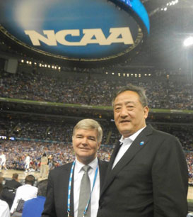 NCAA President Mark Emmert (left) with FISU Vice President Yang Liguo during the NCAA March Madness tournament