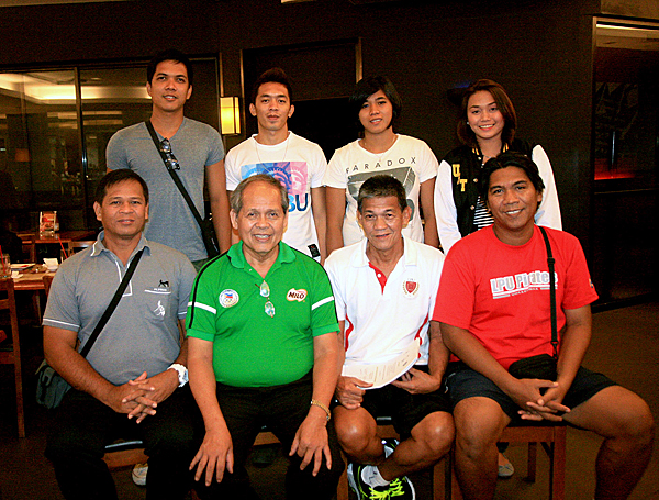 Marcelo C. Joaquin Jr. and John Erickson P. Francisco; Judy Ann A. Caballejo and Maruja M. Banaticla; Coach Sinfromio “Sammy” Acaylar, PSVA President Prof Robert Milton Calo, UST Coach Emiliano C. Lontoc and Coach Henry James Pecaña.