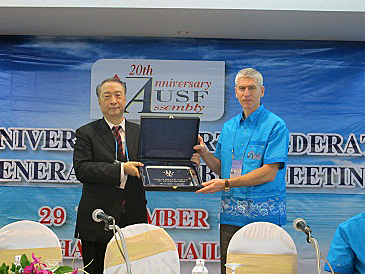 CHA AM – On 29 November, the 7th AUSF General Assembly was held at the Long Beach Hotel in Cha Am, Thailand. Out of the 35 AUSF members, 27 participated in the meeting. During the assembly, the 20th anniversary of AUSF was celebrated as well. The special guests, including FISU 1st Vice-President Oleg Matytsin who attended the meeting on behalf of FISU President Claude-Louis Gallien, FISU Vice President Leonz Eder, EUSA President Adam Roczek and FASU delegate Jacob Stanley Nteere, travelled to Cha Am for the celebration and to congratulate AUSF on a successful and rapid development.