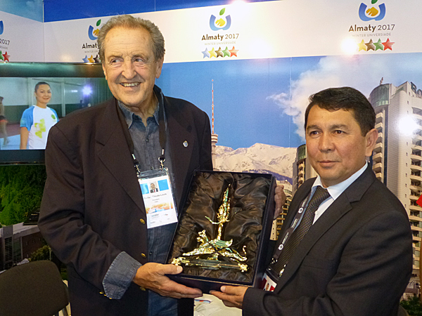 FISU President Gallien receives a gift from Almaty