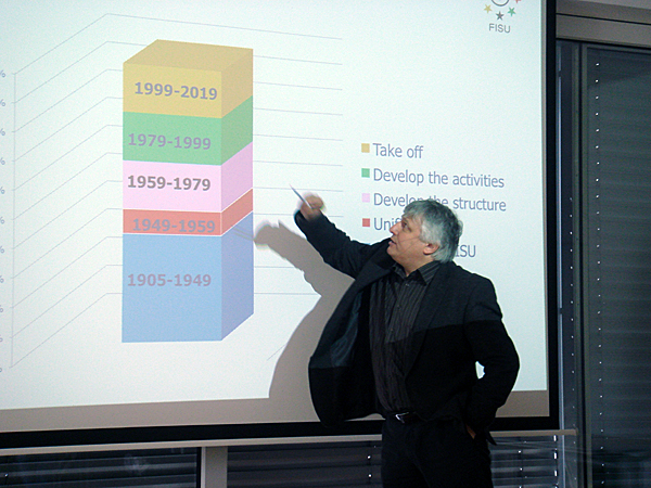 Dr Raphaël Bize from the Institute of Social and Preventive Medicine presented the project ‘Métasanté’ with the goal of promoting sports in the urban area of Lausanne. Eric Saintrond not only gave a historical overview of FISU, but also showed the development of FISU in Lausanne. He presented also some ideas under the motto “Back to Campus”.
