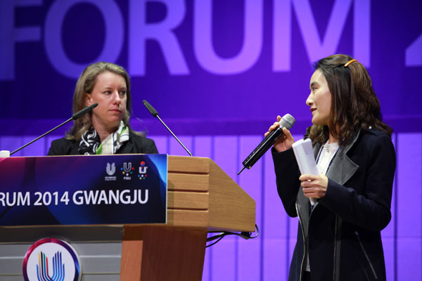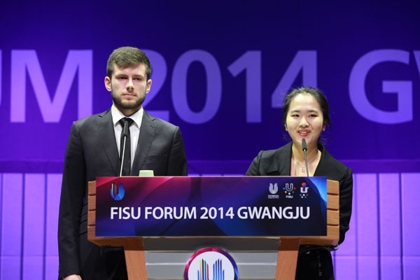 GWANGJU – On the 5th day of the Forum, two Student Committee members, Kacper Czarnota (POL) and Choo Young (KOR), presented a report dedicated to the conclusions of the last Forum which was held in Taipei City (TPE) in 2012. The main theme of this Forum was “University Sport, a platform for Sustainable Development”.