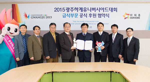 GWANGJU – The Gwangju 2015 Universiade Organizing Committee (GUOC) Secretary General KIM Yoon-suk and Ourhome CEO LEE Seung-woo signed a sponsorship agreement at the GUOC Headquarters on December 22nd. Ourhome, which spun off from LG Group, will provide catering services for the athletes, officials, judges and referees, and other Universiade participants.