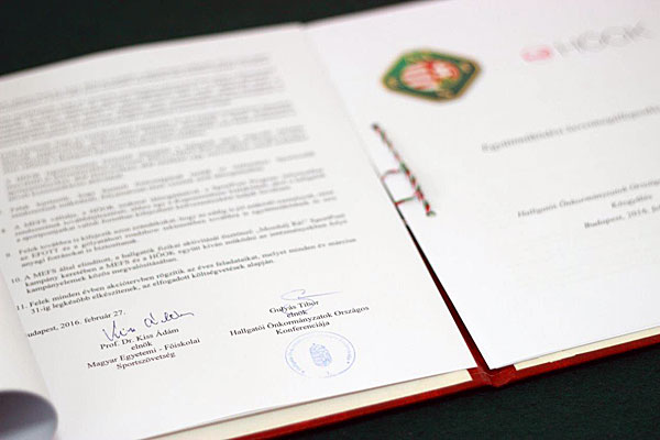 On 27 February, the president of the Hungarian University Sports Federation (HUSF), prof. Dr. Ádám KISS and the president of the National Union of Students in Hungary (NUSH), Mr. Tibor Gulyás signed an agreement aiming at university sport development and health promotion. The ceremony was held as part of the NUSH General Assembly hosted by the Budapest University of Technology and Economics. Participants of the General Assembly uniformly supported the initiative which ensures the strategic cooperation of the two organizations.