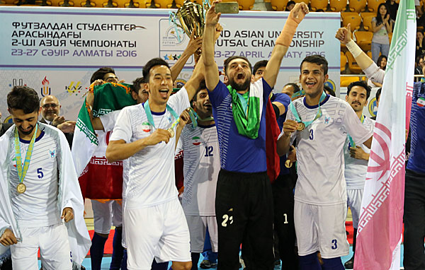 The most important game of the championship, the final between the Kazakhstan national team and the Iran team kicked-off at 17:30. Despite the home advantage and great cheerleading supporters for Kazakhstan, Iran took full control of the game. A total of 12 scores were made solely by the Iranian team. Hence, the Iranian team boasted an overwhelming victory and also managed to defend the title in the 2nd Asian University Futsal Championship. Ali Ebrahimi (10) from Iran was incontrovertibly the best scorer of the championship.