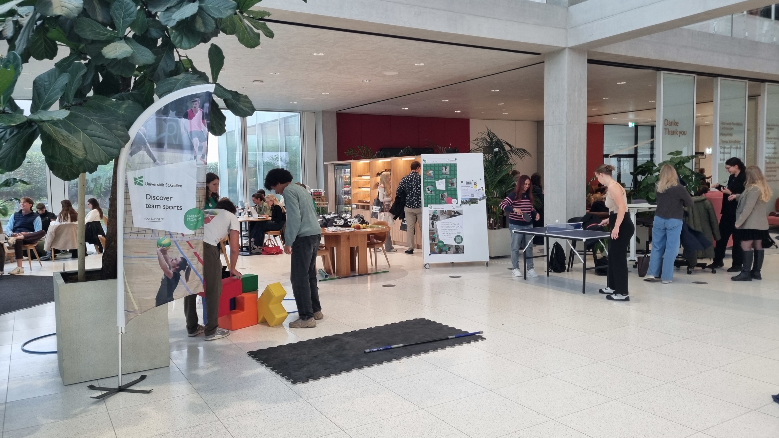 In Switzerland, a university sports challenge stand was set up at various locations across the University of St.Gallen. Participants could choose challenges, had to complete 2 out of 4, and then received a small gift.