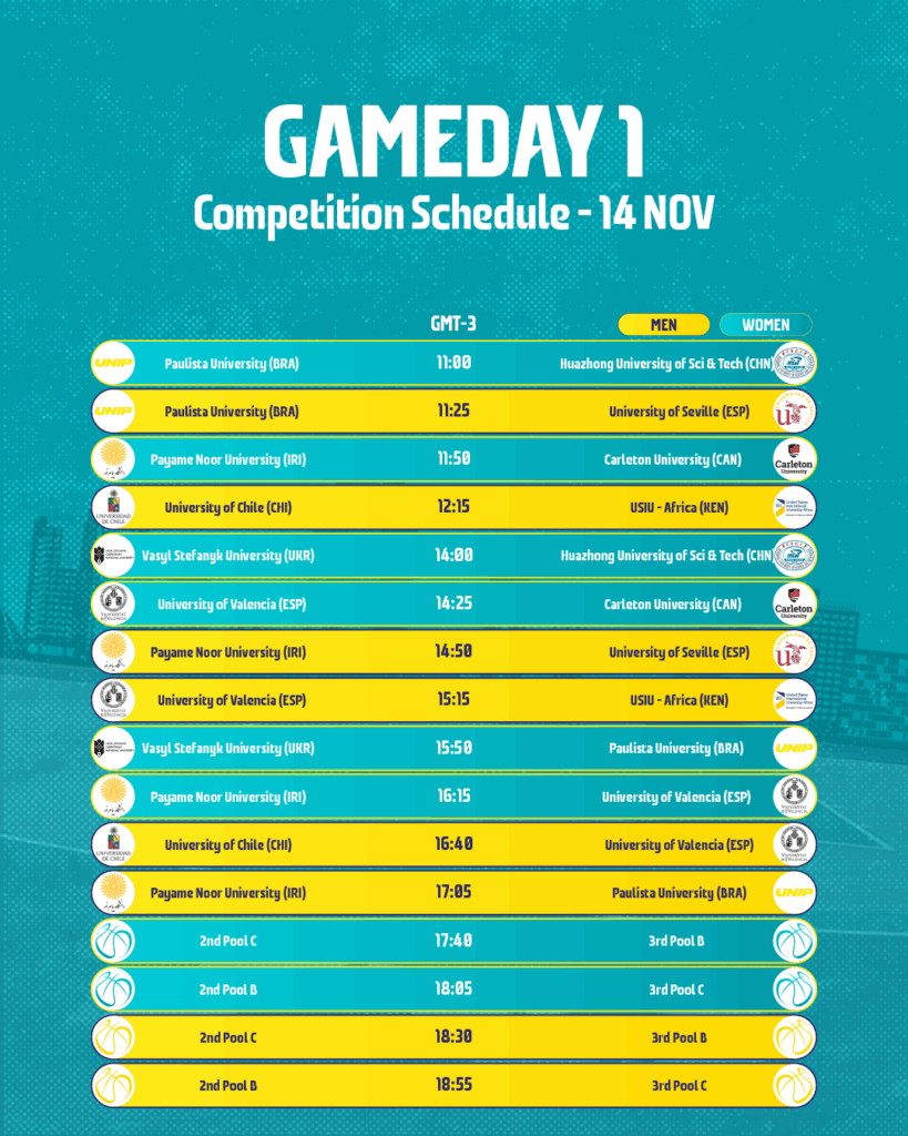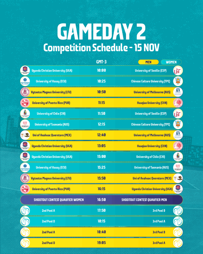Twelve men’s teams and twelve women’s teams from 19 universities and 15 countries will be competing for the trophies during the Brasilia FISU University World Cup 3×3 Basketball from 14-16 November 2025.